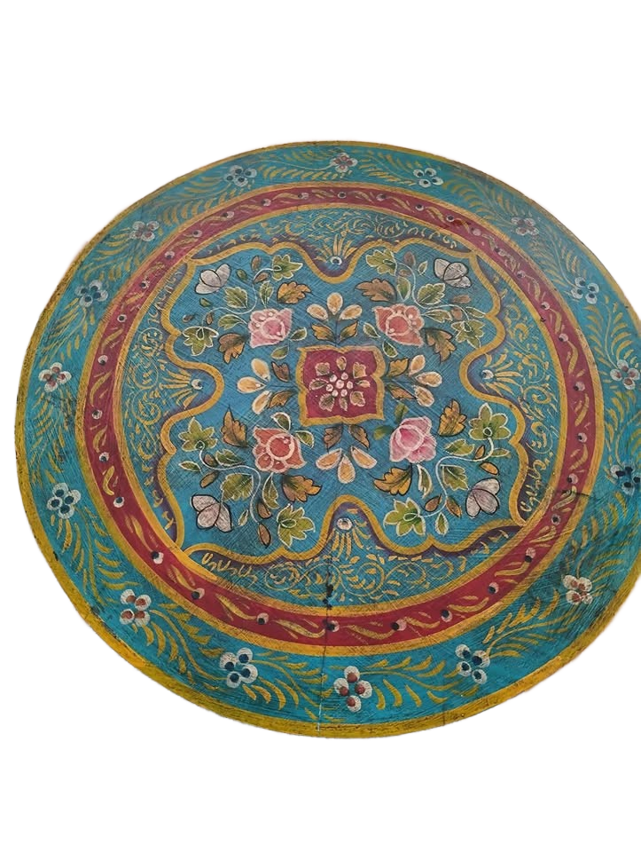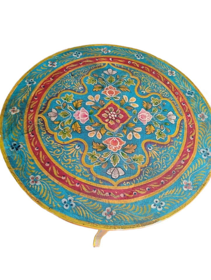 This is a hand-painted accent table, an Indian/Moroccan style side table. It is made of wood and decorated with colorful floral and geometric motifs