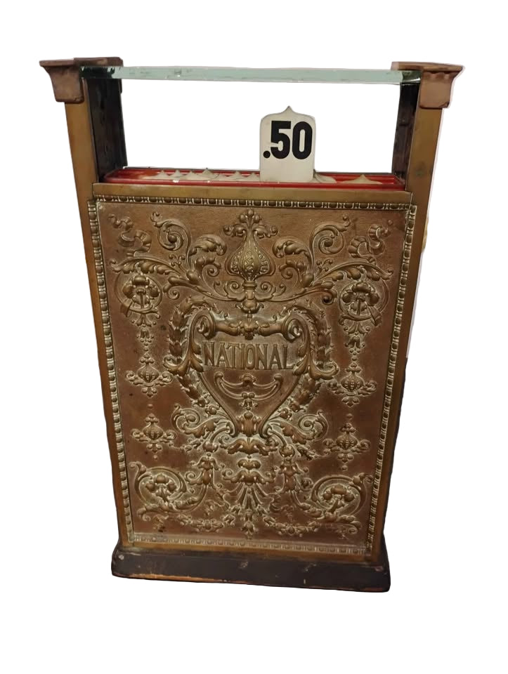 Antique Brass National Cash Register. Works great. I have sold a few of these. This is my last one. The register is about 10" wide and 16" tall. It weighs about 70 lbs.