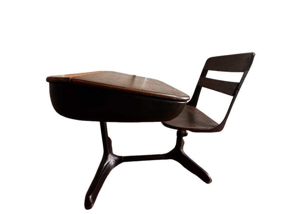 Classic vintage school desk from the 1940s–60s, featuring a sturdy cast iron frame and solid wood desktop and seat. This timeless piece includes a lift-top writing surface with built-in storage — perfect for kids, homeschool setups, or as a unique vintage decor item.