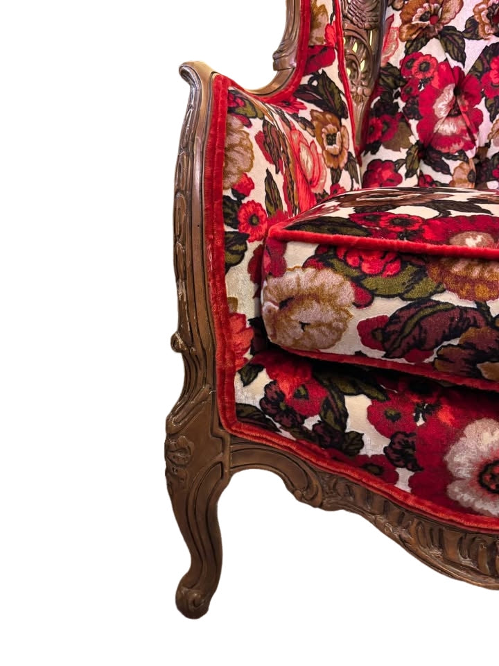 beautiful reupholstered wingback chair with ornate wood carvings of cherubs