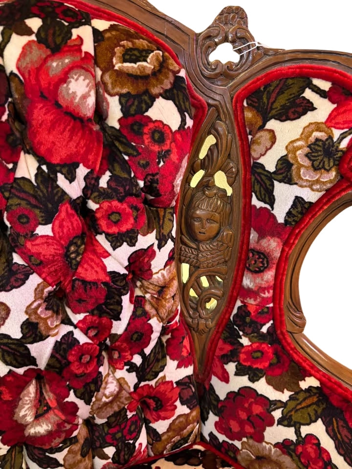Listing is for beautiful reupholstered wingback chair with ornate wood carvings of cherubs! AND very comfortable