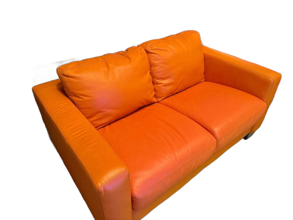 Orange Italian leather accent chair and matching loveseat in excellent condition. Rich, high-quality leather with minimal wear and plenty of life left. Perfect statement pieces for a movie room, den, or any space that needs a bold pop of color and comfort.