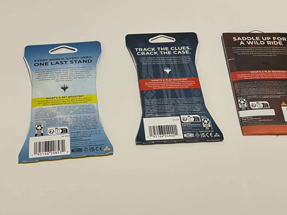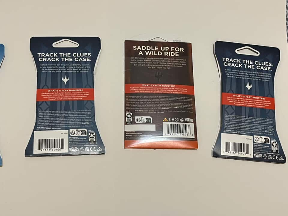- The "Murders at Karlov Manor" and "Outlaws of Thunder Junction" packs are "Play Boosters" and contain 14 cards each.