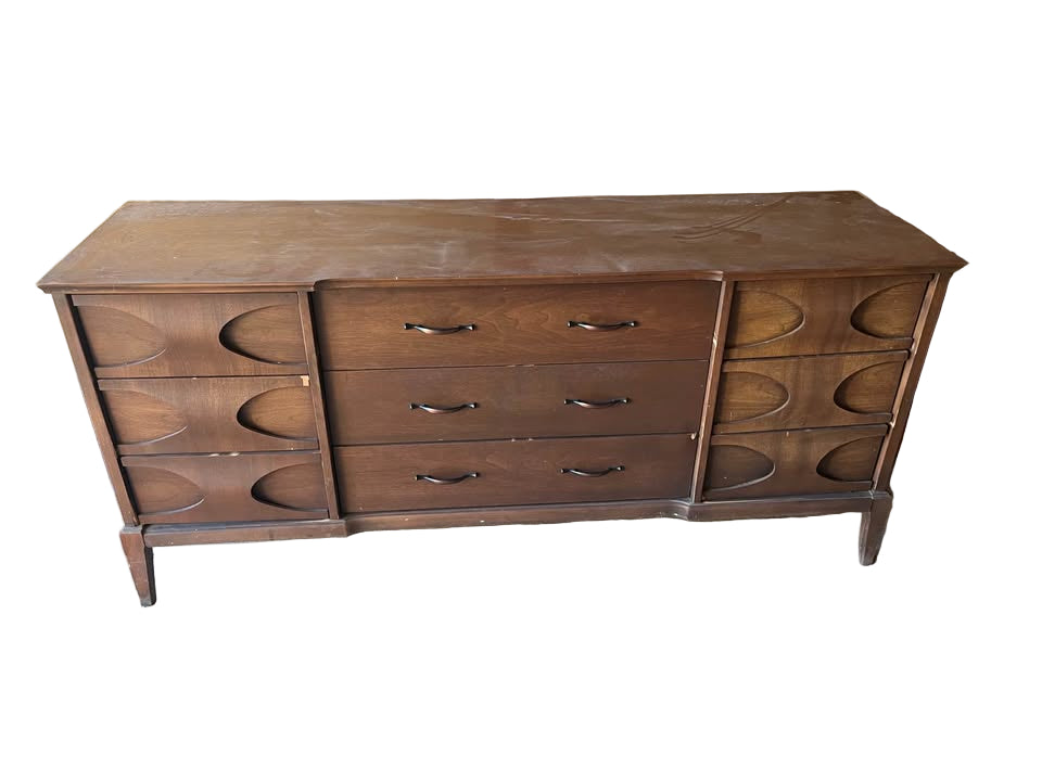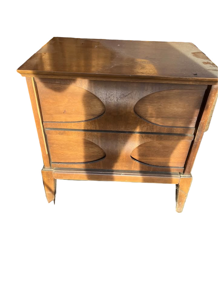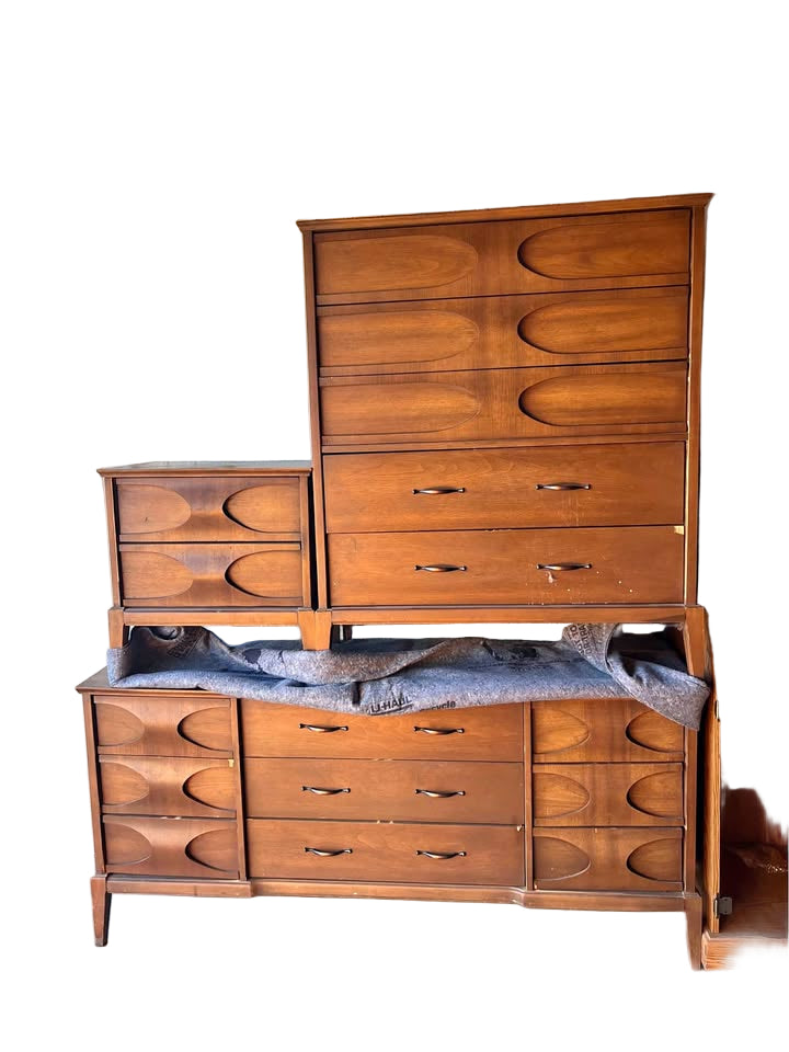 Mid-century furniture set. Tall dresser, short long dresser with mirror, end table. Aged but all drawers pull in and out no issues.