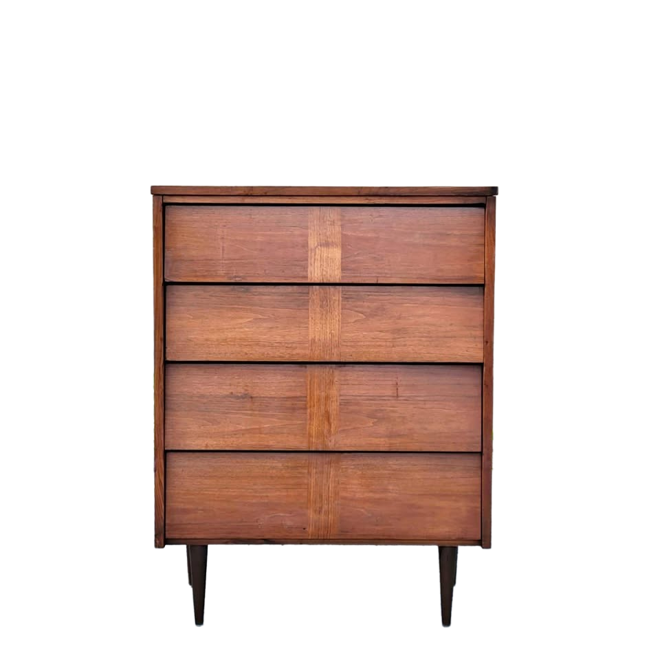 A tallboy dresser with 4 dovetail jointed drawers. Has a laminate top safe from scuffs and scratching, and a teak finish all over. Straight, tapered legs, a contrasting wood inlay on the center of each drawer face, and flared drawer fronts make this piece classic, minimal, and mid century modern. Just what you need for your bedroom or closet. Made by Ward in the USA, most likely in the 1970s.