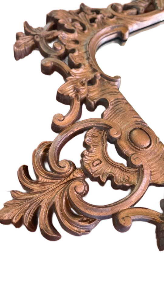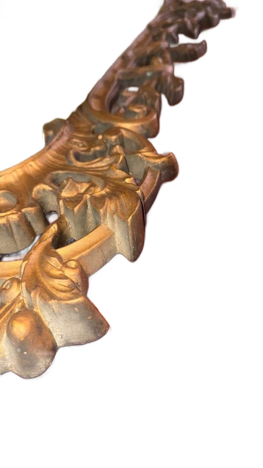 44” x 26.5” widest point Gilded mirror, Turner Manufacturing, in the mid-20th century. Rococo style, characterized by ornate details and gilded finish. The mirror's frame is elaborately decorated with floral and scroll motifs, a hallmark of the Rococo style. It is made of wood or composite material with a gold-toned finish