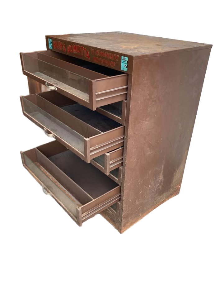 Amazing Antique Nuns Nomatta Storage cabinet with unique display drawers. Beautiful typography. Nice vintage condition. Some rusting on the bottom shown in pictures. The cabinet measures 28 1/2 x 22 1/2 x 40“ tall.