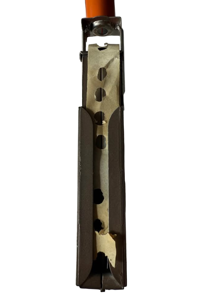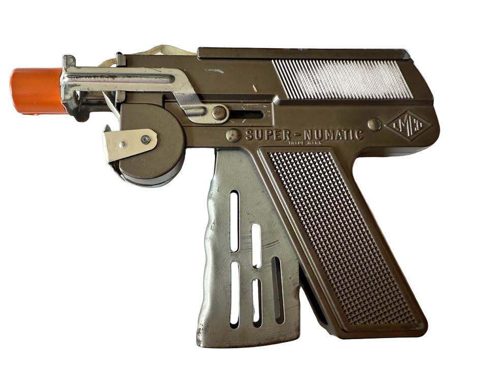 VINTAGE LMCO Super-Numatic Harmless Paper Buster Gun Cap Pistol Toy w/ Box. A beautiful example of this toy pistol. Comes with loaded roll of paper ammunition. This replica gun contains the colored markings required by law, including a permanently attached orange plug