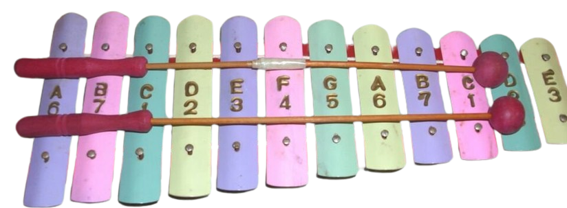 A Rare & Vintage Late 1940's ~ Early 1950's Japanese Tin Portable Xylophone. In the Original Box, Carrying Case. The Graphics are outstanding! Tough Find! Very cute & cool vintage tin toy from Japan! Fresh out of an antique collector's estate. Remarkable condition for its age. One of the hammers was taped long ago, I reinforced the hammer over the original tape with fiberglass tape. Considering being found with both hammers, not bad at all. The keys are a little dirty as found in the estate. We purchase and sell items from vintage estates in their natural as found condition. An excellent vintage toy collectible that would make an outstanding addition to your vintage toy collection. The Xylophone measures 11" inches in length by 5" inches in its widest area.