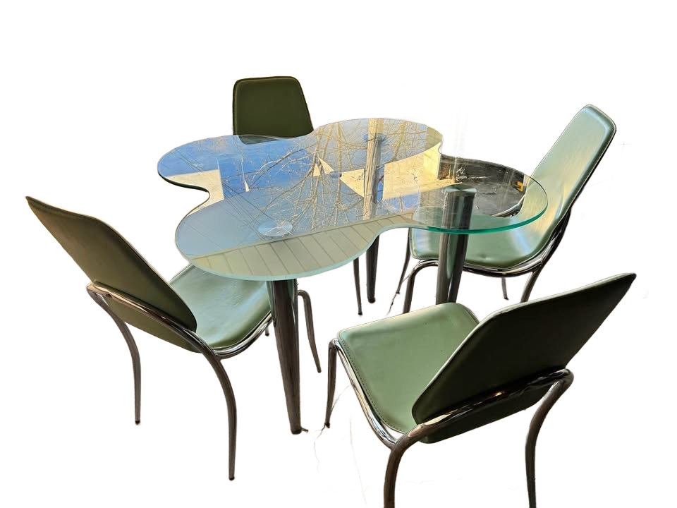 This is a very old retro vintage glass table and matching chairs. It is in great shape for its age. All chairs are sturdy. Minor blemishes in upholster