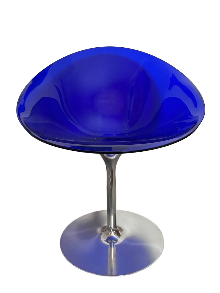 This super cool chair was designed by Philippe Starck for Kartell. The molded chair is sleek, surprisingly comfortable, and features a fun bright blue color. The base of the chair is a stunning chrome color and easily rotates. This chair is perfect for use as an office chair, a mismatched dining chair, or as an accent in your living space.