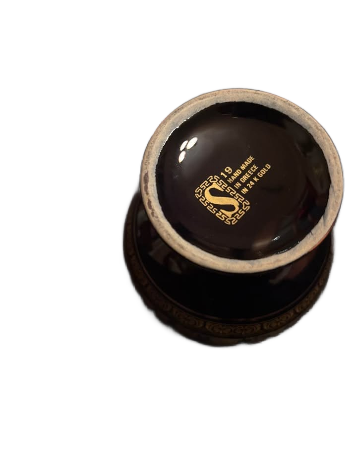 Beautiful and unique piece ! The combination of handmade porcelain and 24 K gold trims is stunning . The size is 10” tall and 5” wide, makes it a lovely addition to any home decor . Spyropolos designs are inspired by Ancient Greece and known for their intricate details ,traditional Greek motifs , and black color. Perfect for collectors .