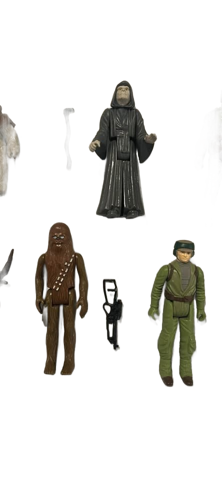 Seven vintage Star Wars figures all complete with original accessories…. Chief chirpa Logray Chewbacca Boba fett Rebel guard Lando Emperor