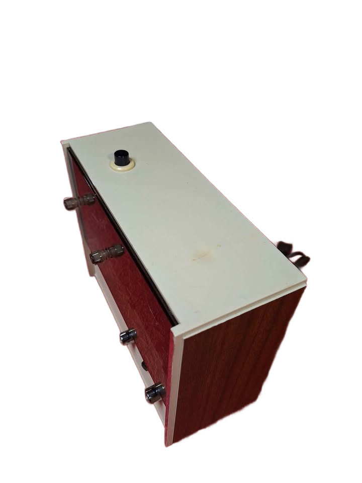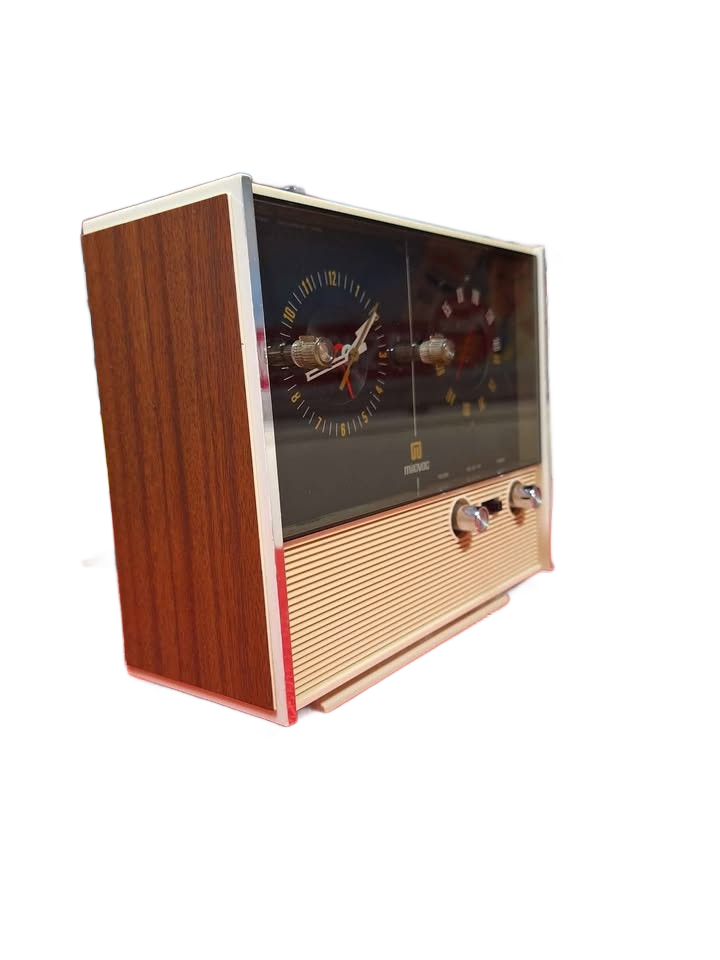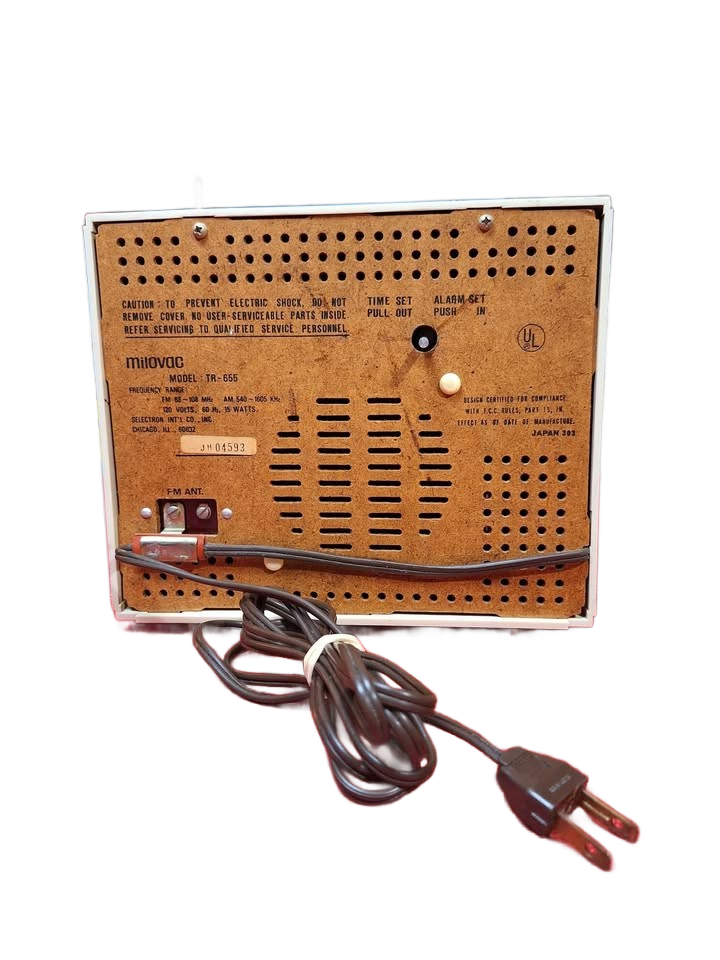 True vintage mid-century modern 1960s Milovac AM/FM Clock Radio. Works perfectly. Both AM & FM Bands come in easily. Clock runs and keeps correct time. No chips or cracks to the cabinet.